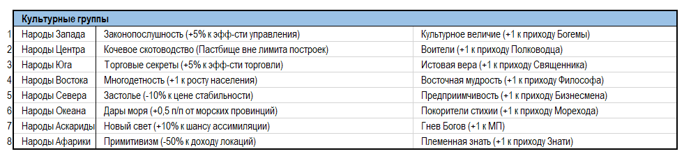 Население провинций обладают этническими отличиями (культурами). Как правило, культура столичной провинции страны является титульной культурой всего государства. Но не всегда. В игре могут присутствовать страны, в которых культура правящей династии обладает культурой, не совпадающей ни с одной из имеющихся в стране. Такая ситуация характерна для вновь образованных в ходе иноземного завоевания стран.