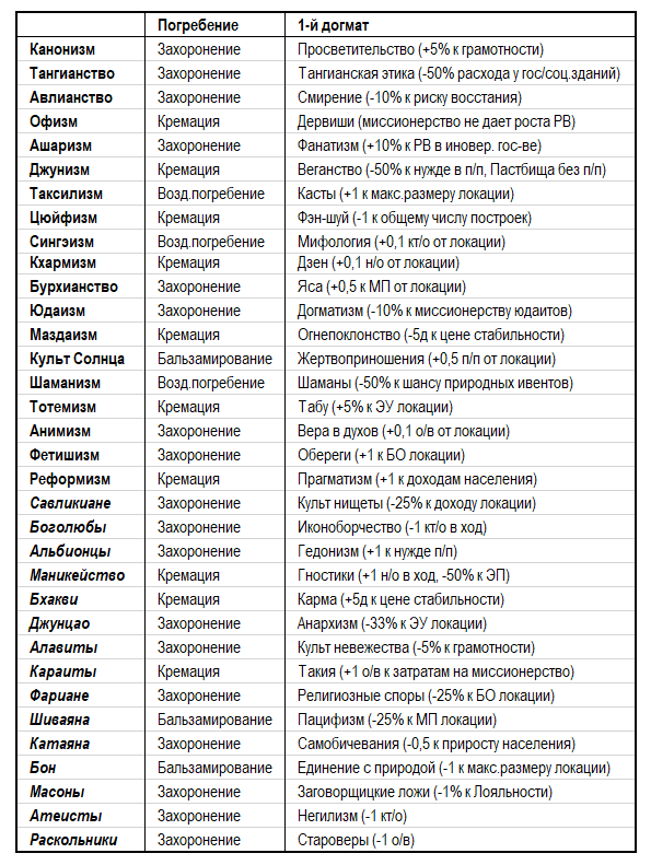 Это их отличительные особенности. 1-й догмат дан изначально. Он неизменяем. Принять 2-й догмат можно по решению игрока. Его можно выбрать из 3-х данных вариантов. Принятие 2-го догмата осуществляется в целом для всех стран, исповедующих данную религию. 2-й догмат (варианты 2-го догмата даны в балансах) можно менять, тратя на это очки веры о/в.