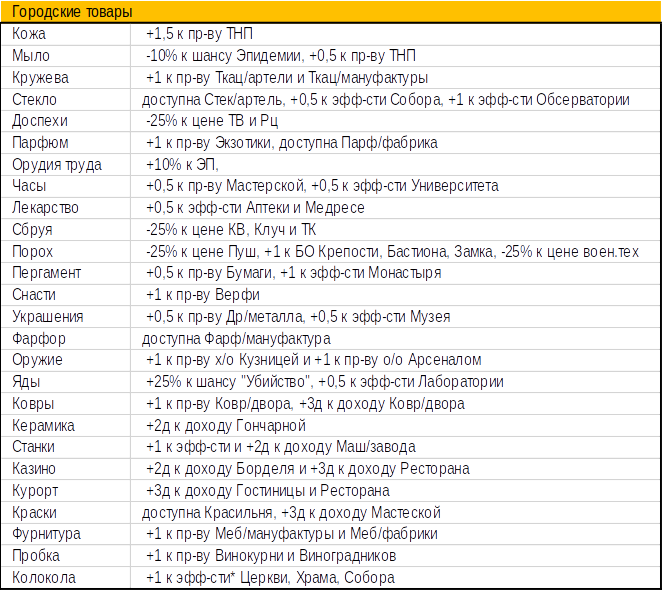 При достижении городом 5-го размера, в нём начинает производиться определенный «городской товар», дающий различные бонусы: