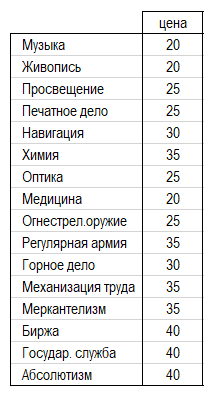 Также в балансе указана стоимость каждой научного знания, доступного игроку, а также годы возможного изучения неизвестных технологий. Изучение технологии ранее установленного года их изучения не возможно. Постепенно, по мере изучения технологий другими странами, стоимость технологий уменьшается.