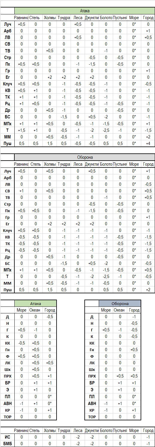 В приведенной ниже таблице схематично указаны где (ландшафт) или при каких видах военных действий (оборона или атака, штурм и т.п.) юниты имеют бонусы и штрафы к своей номинальной силе.