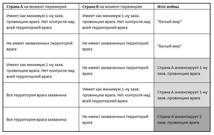 Если на момент введения перемирия сторона имеет (на основании факта оккупации территории врага) право на аннексию территории врага (см. таблицу), то она вправе заявить об этом. В противном случае война завершается «белым» миром.