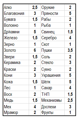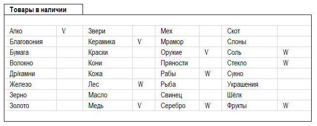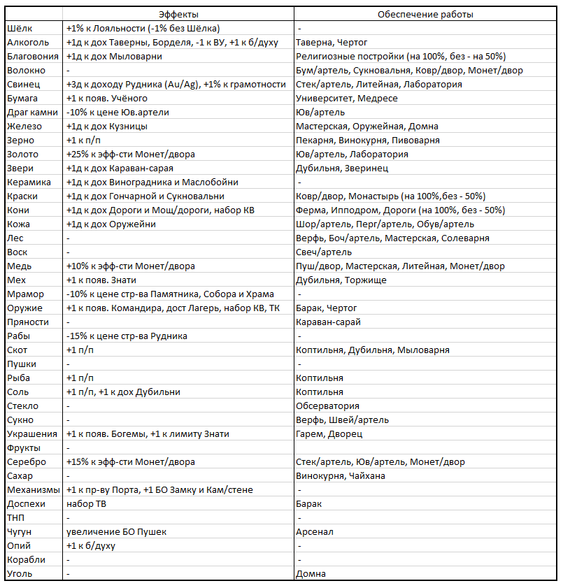 Каждый товар в игре имеет свою специфику, предоставляя доступ к строительству Построек, или давая определенные бонусы стране.
