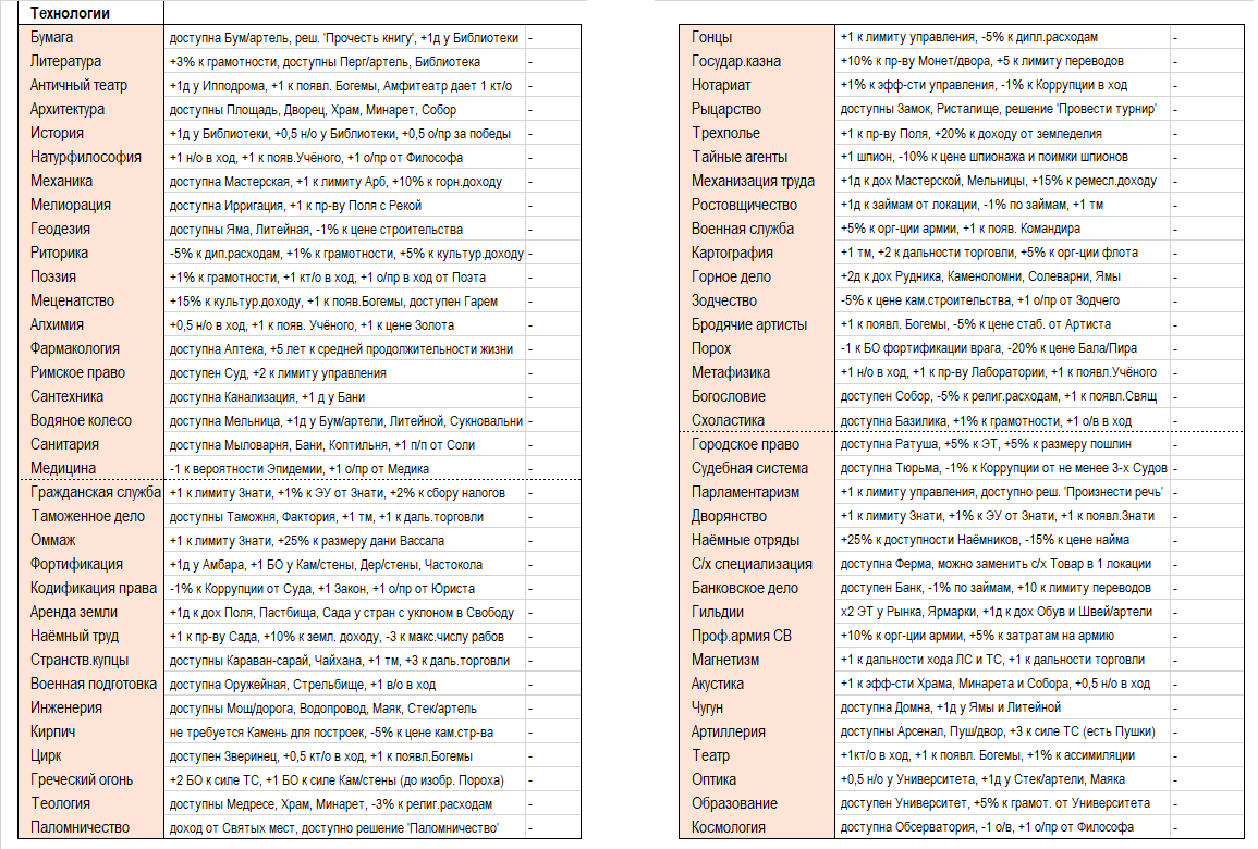 Эффекты от изучения тех или иных технологий становятся доступными уже в ход их изучения.